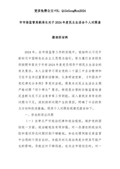 【七哥公文】2025年:市市场监管局副局长关于2024年度民主生活会个人对照查摆剖析材料+更多免费公文+VX:QiGeGongWen2024+更多免费公文+VX:QiGeGongWen2024