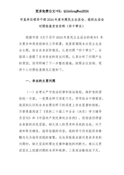 【七哥公文】2025年:市直单位领导干部2024年度专题民主生活会、组织生活会对照检查发言材料(四个带头)+更多免费公文+VX:QiGeGongWen2024+更多免费公文+VX:QiGeGongWen2024