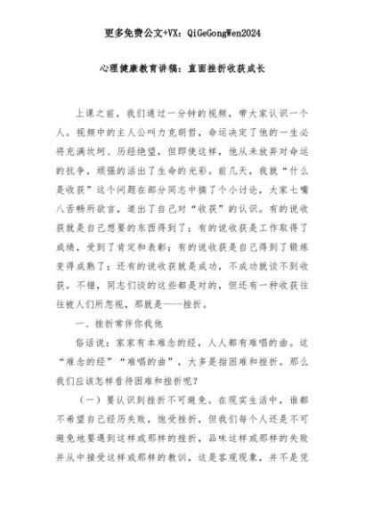 【七哥公文】2025年:心理健康教育讲稿:直面挫折收获成长+更多免费公文+VX:QiGeGongWen2024+更多免费公文+VX:QiGeGongWen2024