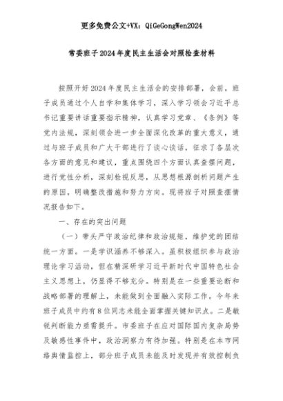 【七哥公文】2025年:常委班子2024年度民主生活会对照检查材料+更多免费公文+VX:QiGeGongWen2024+更多免费公文+VX:QiGeGongWen2024