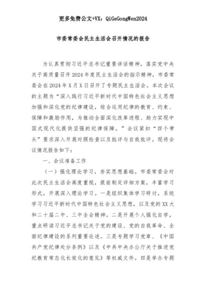 【七哥公文】2025年:市委常委会民主生活会召开情况的报告+更多免费公文+VX:QiGeGongWen2024+更多免费公文+VX:QiGeGongWen2024