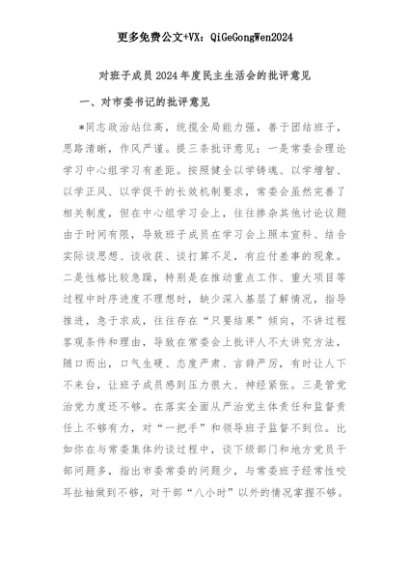 【七哥公文】2025年:对班子成员2024年度民主生活会的批评意见+更多免费公文+VX:QiGeGongWen2024+更多免费公文+VX:QiGeGongWen2024
