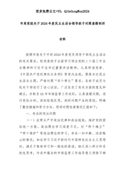 【七哥公文】2025年:市局党组关于2024年度民主生活会领导班子对照查摆剖析材料+更多免费公文+VX:QiGeGongWen2024+更多免费公文+VX:QiGeGongWen2024