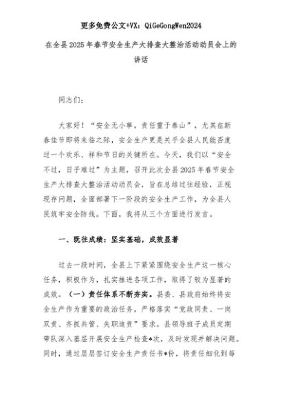 【七哥公文】2025年:在全县2025年春节安全生产大排查大整治活动动员会上的讲话+更多免费公文+VX:QiGeGongWen2024+更多免费公文+VX:QiGeGongWen2024
