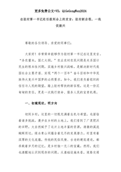 【七哥公文】2025年:在驻村第一书记赴任报到会上的发言:驻村新启程,一线促振兴+更多免费公文+VX:QiGeGongWen2024+更多免费公文+VX:QiGeGongWen2024