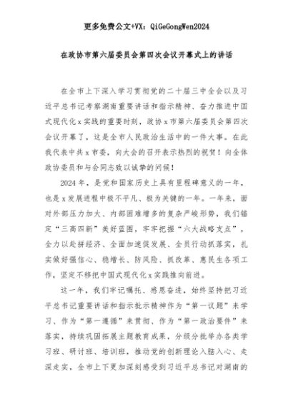 【七哥公文】2025年:在政协市第六届委员会第四次会议开幕式上的讲话+更多免费公文+VX:QiGeGongWen2024+更多免费公文+VX:QiGeGongWen2024