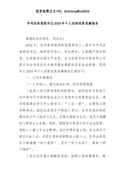【七哥公文】2025年:市司法局党组书记2024年个人述职述责述廉报告+更多免费公文+VX:QiGeGongWen2024+更多免费公文+VX:QiGeGongWen2024