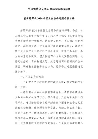 【七哥公文】2025年:宣传部部长2024年民主生活会对照检查材料+更多免费公文+VX:QiGeGongWen2024+更多免费公文+VX:QiGeGongWen2024