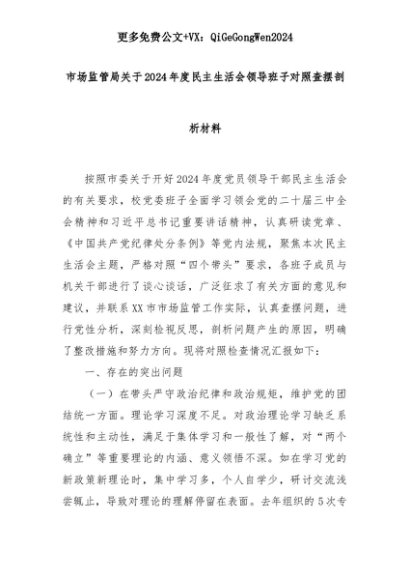 【七哥公文】2025年:市场监管局关于2024年度民主生活会领导班子对照查摆剖析材料+更多免费公文+VX:QiGeGongWen2024+更多免费公文+VX:QiGeGongWen2024