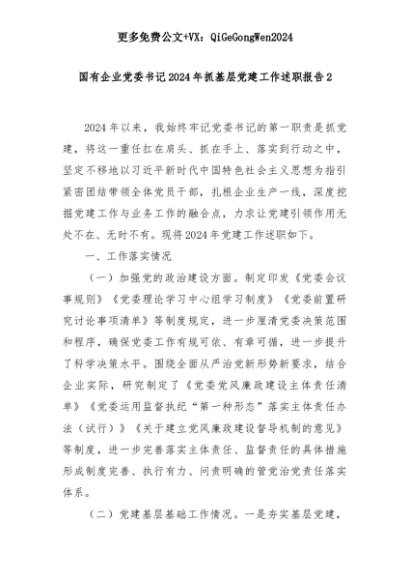 【七哥公文】2025年:国有企业党委书记2024年抓基层党建工作述职报告2+更多免费公文+VX:QiGeGongWen2024+更多免费公文+VX:QiGeGongWen2024