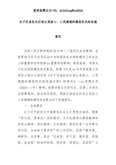 【七哥公文】2025年:关于区直机关打造让党放心、人民满意的模范机关的实施意见+更多免费公文+VX:QiGeGongWen2024+更多免费公文+VX:QiGeGongWen2024