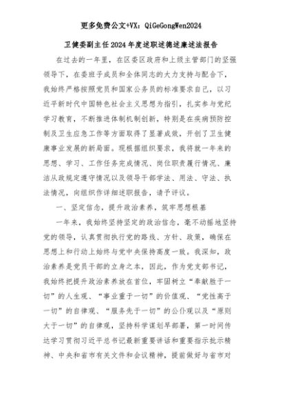 【七哥公文】2025年:卫健委副主任2024年度述职述德述廉述法报告+更多免费公文+VX:QiGeGongWen2024+更多免费公文+VX:QiGeGongWen2024