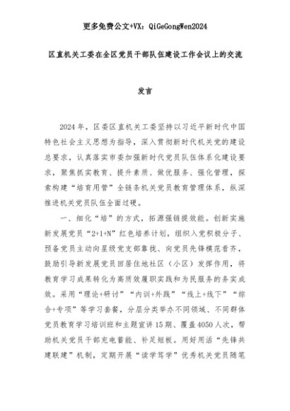 【七哥公文】2025年:区直机关工委在全区党员干部队伍建设工作会议上的交流发言+更多免费公文+VX:QiGeGongWen2024+更多免费公文+VX:QiGeGongWen2024