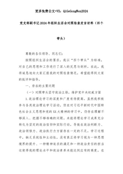 【七哥公文】2025年:党支部副书记2024年组织生活会对照检查发言材料(四个带头)+更多免费公文+VX:QiGeGongWen2024+更多免费公文+VX:QiGeGongWen2024