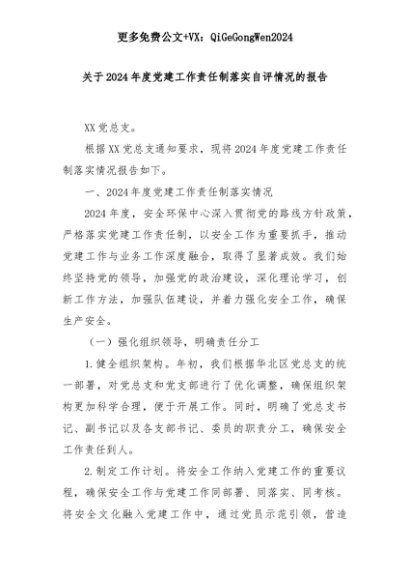 【七哥公文】2025年:关于2024年度党建工作责任制落实自评情况的报告+更多免费公文+VX:QiGeGongWen2024+更多免费公文+VX:QiGeGongWen2024