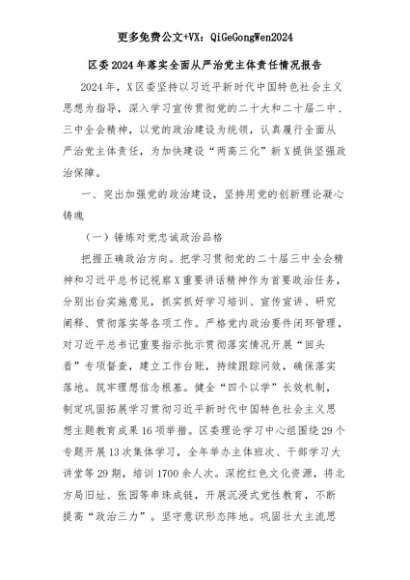 【七哥公文】2025年:区委2024年落实全面从严治党主体责任情况报告+更多免费公文+VX:QiGeGongWen2024+更多免费公文+VX:QiGeGongWen2024