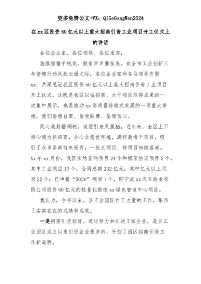 【七哥公文】2025年:在xx区投资50亿元以上重大招商引资工业项目开工仪式上的讲话+更多免费公文+VX:QiGeGongWen2024+更多免费公文+VX:QiGeGongWen2024
