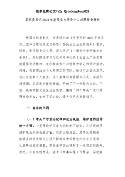 【七哥公文】2025年:县纪委书记2024年度民主生活会个人对照检查材料+更多免费公文+VX:QiGeGongWen2024+更多免费公文+VX:QiGeGongWen2024