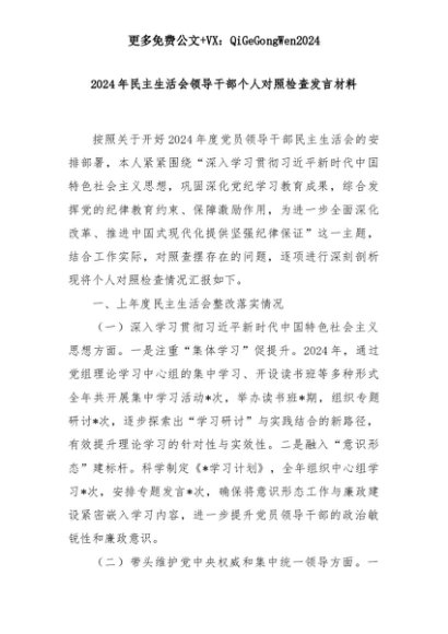 【七哥公文】2025年:2024年民主生活会领导干部个人对照检查发言材料+更多免费公文+VX:QiGeGongWen2024+更多免费公文+VX:QiGeGongWen2024