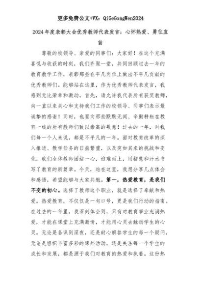 【七哥公文】2025年:2024年度表彰大会优秀教师代表发言:心怀热爱、勇往直前+更多免费公文+VX:QiGeGongWen2024+更多免费公文+VX:QiGeGongWen2024
