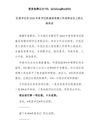 【七哥公文】2025年:区委书记在2024年度书记抓基层党建工作述职会议上的主持讲话+更多免费公文+VX:QiGeGongWen2024+更多免费公文+VX:QiGeGongWen2024