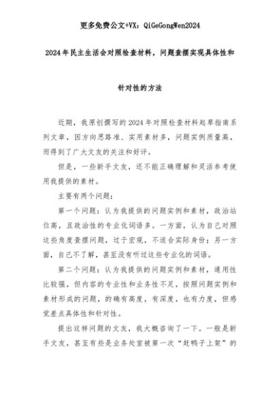 【七哥公文】2025年:2024年民主生活会对照检查材料,问题查摆实现具体性和针对性的方法+更多免费公文+VX:QiGeGongWen2024+更多免费公文+VX:QiGeGongWen2024