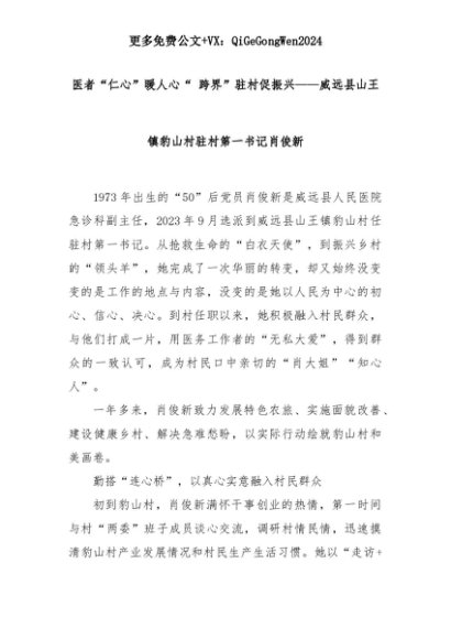 【七哥公文】2025年:医者“仁心”暖人心“ 跨界”驻村促振兴——威远县山王镇豹山村驻村第一书记肖俊新+更多免费公文+VX:QiGeGongWen2024+更多免费公文+VX:QiGeGongWen2024
