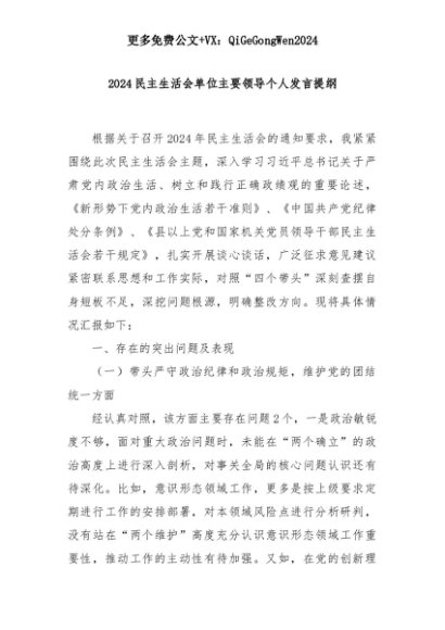 【七哥公文】2025年:2024民主生活会单位主要领导个人发言提纲+更多免费公文+VX:QiGeGongWen2024+更多免费公文+VX:QiGeGongWen2024