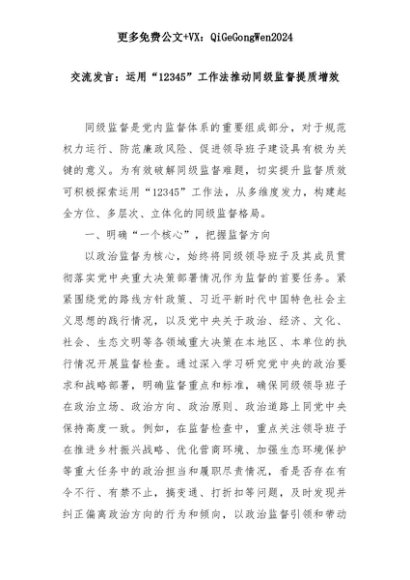 【七哥公文】2025年:交流发言:运用“12345”工作法推动同级监督提质增效+更多免费公文+VX:QiGeGongWen2024+更多免费公文+VX:QiGeGongWen2024