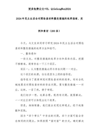 【七哥公文】2025年:2024年民主生活会对照检查材料整改措施的起草指南、实例和素材(200条)+更多免费公文+VX:QiGeGongWen2024+更多免费公文+VX:QiGeGongWen2024