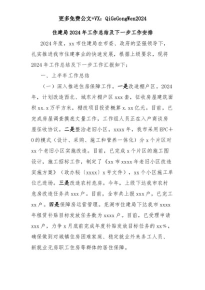 【七哥公文】2025年:住建局2024年工作总结及下一步工作安排+更多免费公文+VX:QiGeGongWen2024+更多免费公文+VX:QiGeGongWen2024