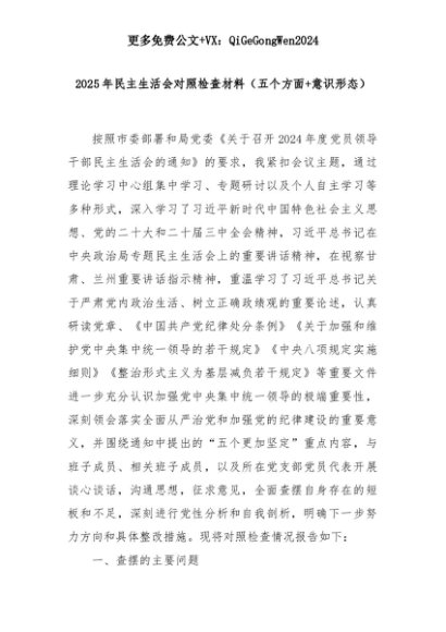 【七哥公文】2025年:2025年民主生活会对照检查材料(五个方面+意识形态)+更多免费公文+VX:QiGeGongWen2024+更多免费公文+VX:QiGeGongWen2024