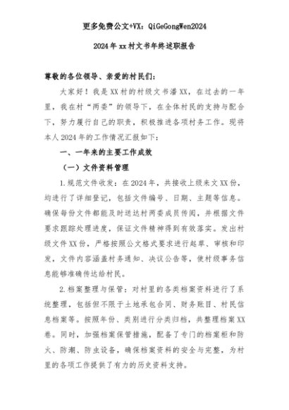 【七哥公文】2025年:2024年xx村文书述职报告+更多免费公文+VX:QiGeGongWen2024+更多免费公文+VX:QiGeGongWen2024