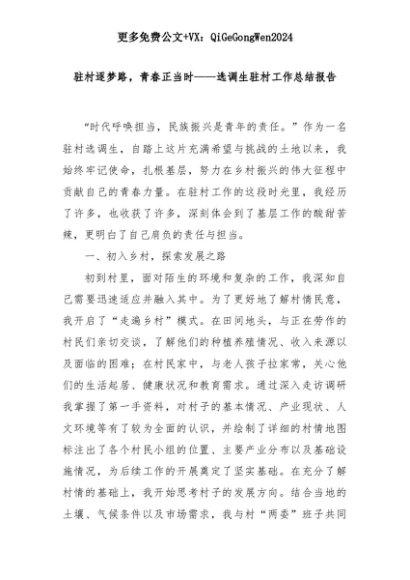 【七哥公文】2025年:驻村逐梦路,青春正当时——选调生驻村工作总结报告+更多免费公文+VX:QiGeGongWen2024+更多免费公文+VX:QiGeGongWen2024