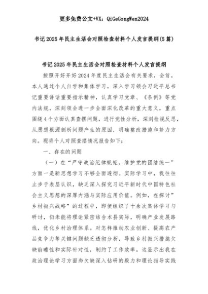 【七哥公文】2025年:(5篇)书记2025年民主生活会对照检查材料个人发言提纲+更多免费公文+VX:QiGeGongWen2024+更多免费公文+VX:QiGeGongWen2024
