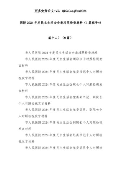 【七哥公文】2025年:(9篇)医院2024年度民主生活会全套对照检查材料(1篇班子+8篇个人)+更多免费公文+VX:QiGeGongWen2024+更多免费公文+VX:QiGeGongWen2024