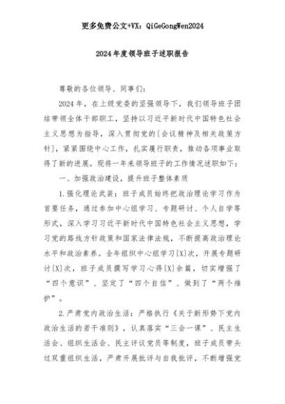【七哥公文】2025年:2024 年度领导班子述职报告+更多免费公文+VX:QiGeGongWen2024+更多免费公文+VX:QiGeGongWen2024
