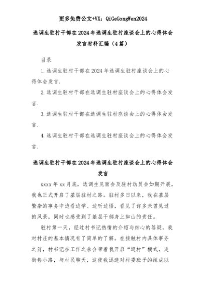 【七哥公文】2025年:选调生驻村干部在2024年选调生驻村座谈会上的心得体会发言材料汇编(4篇)+更多免费公文+VX:QiGeGongWen2024+更多免费公文+VX:QiGeGongWen2024