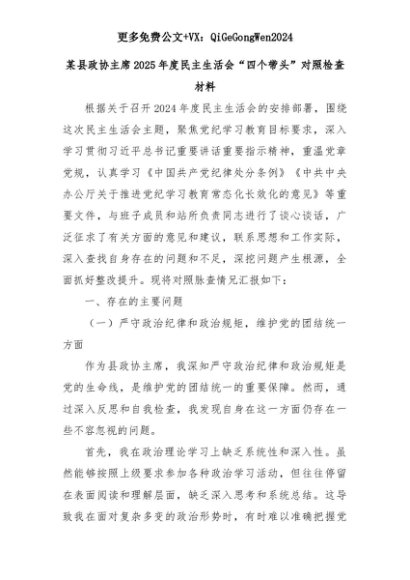 【七哥公文】2025年:某县政协主席2025年度民主生活会“四个带头”对照检查材料+更多免费公文+VX:QiGeGongWen2024+更多免费公文+VX:QiGeGongWen2024