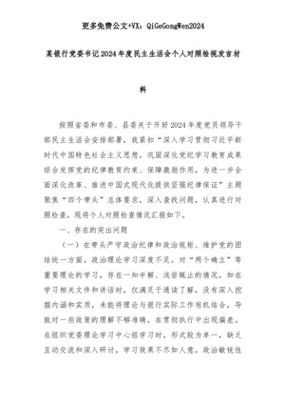 【七哥公文】2025年:某银行党委书记2024年度民主生活会个人对照检视发言材料+更多免费公文+VX:QiGeGongWen2024+更多免费公文+VX:QiGeGongWen2024