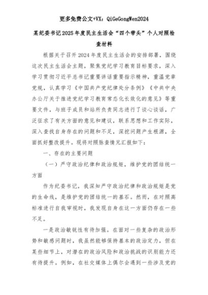 【七哥公文】2025年:某纪委书记2025年度民主生活会“四个带头”个人对照检查材料+更多免费公文+VX:QiGeGongWen2024+更多免费公文+VX:QiGeGongWen2024