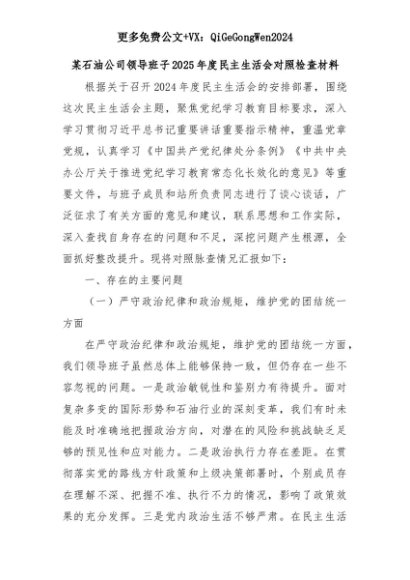 【七哥公文】2025年:某石油公司领导班子2025年度民主生活会对照检查材料+更多免费公文+VX:QiGeGongWen2024+更多免费公文+VX:QiGeGongWen2024