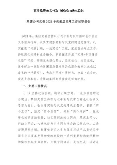 【七哥公文】2025年:集团公司党委2024年抓基层党建工作述职报告+更多免费公文+VX:QiGeGongWen2024+更多免费公文+VX:QiGeGongWen2024