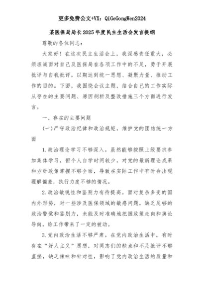 【七哥公文】2025年:某医保局局长2025年度民主生活会发言提纲+更多免费公文+VX:QiGeGongWen2024+更多免费公文+VX:QiGeGongWen2024