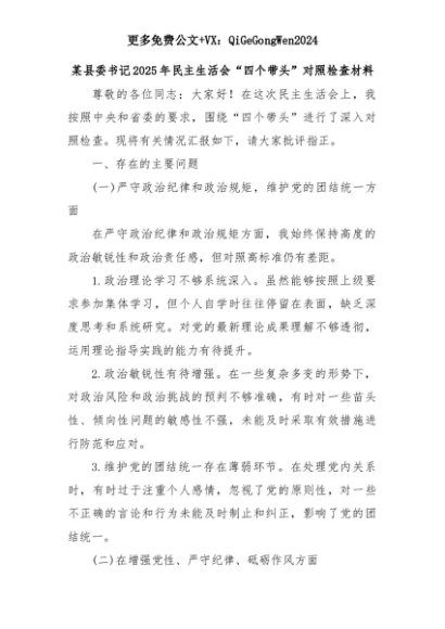 【七哥公文】2025年:某县委书记2025年民主生活会“四个带头”对照检查材料+更多免费公文+VX:QiGeGongWen2024+更多免费公文+VX:QiGeGongWen2024