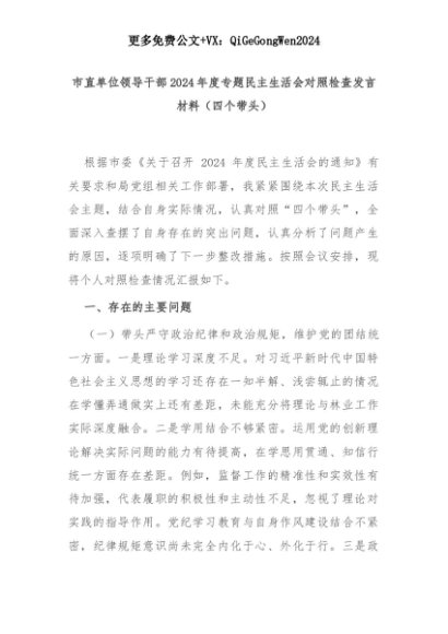 【七哥公文】2025年:市直单位领导干部2024年度专题民主生活会对照检查发言材料(四个带头)+更多免费公文+VX:QiGeGongWen2024+更多免费公文+VX:QiGeGongWen2024