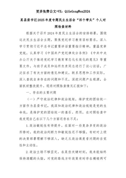 【七哥公文】2025年:某县委书记2025年度专题民主生活会“四个带头”个人对照检查材料+更多免费公文+VX:QiGeGongWen2024+更多免费公文+VX:QiGeGongWen2024