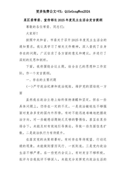 【七哥公文】2025年:某区委常委、宣传部长2025年度民主生活会发言提纲+更多免费公文+VX:QiGeGongWen2024+更多免费公文+VX:QiGeGongWen2024