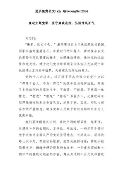 【七哥公文】2025年:廉政主题党课:坚守廉政底线,弘扬清风正气+更多免费公文+VX:QiGeGongWen2024+更多免费公文+VX:QiGeGongWen2024