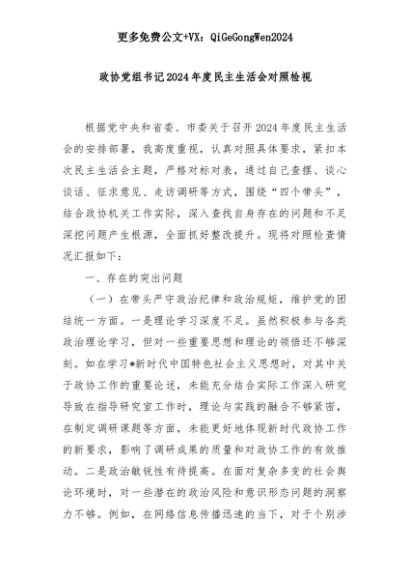 【七哥公文】2025年:政协党组书记2024年度民主生活会对照检视+更多免费公文+VX:QiGeGongWen2024+更多免费公文+VX:QiGeGongWen2024
